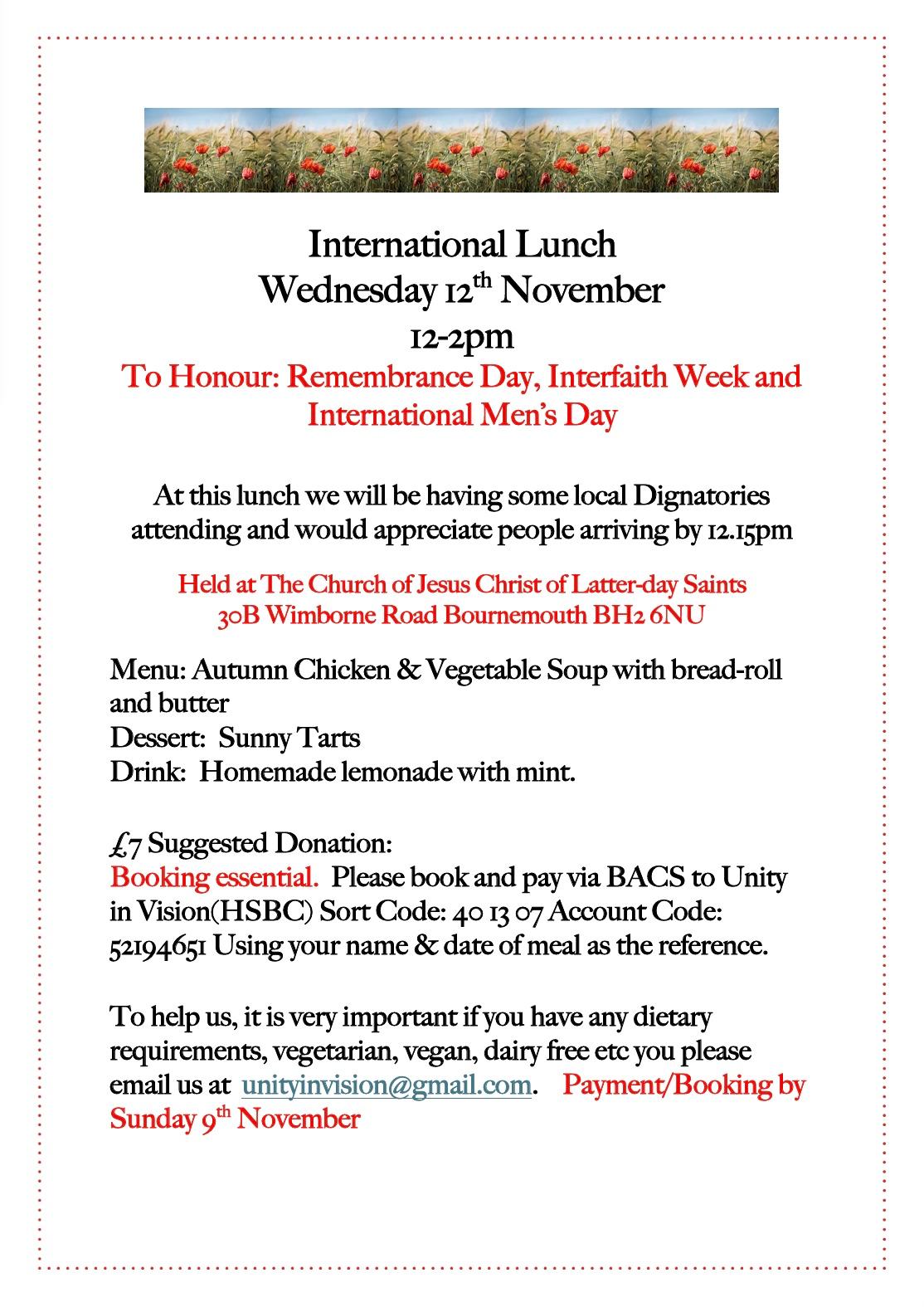 Wednesday 12th November 12-2pm To Honour: Remembrance Day, Interfaith Week and International Men’s Day At this lunch we will be having some local Dignitaries attending and would appreciate people arriving by 12.15pm Held at The Church of Jesus Christ of Latter-day Saints 30B Wimborne Road Bournemouth BH2 6NU Menu: Autumn Chicken & Vegetable Soup with […]