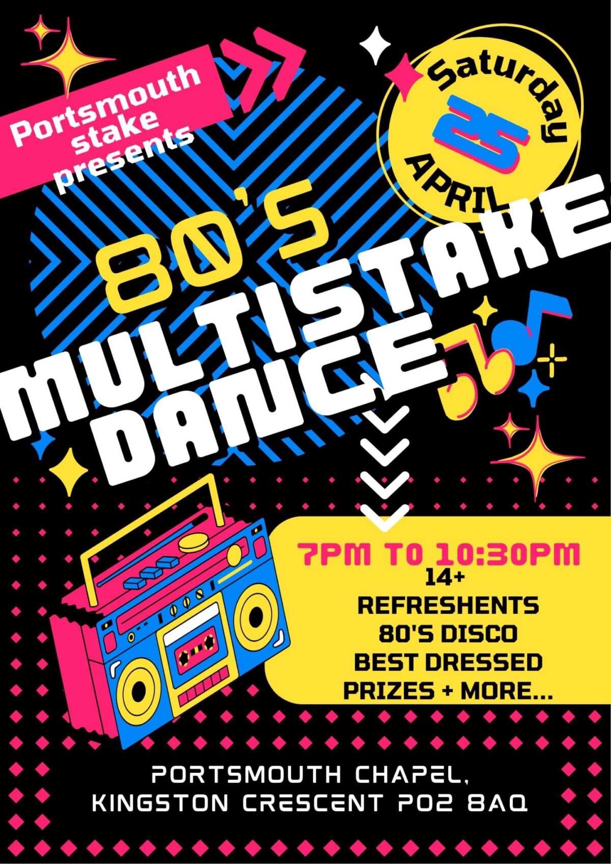 Portsmouth Stake Presents 80’S MULTISTAKE DANCE Date: Saturday 25 April 2026Time: 7:00pm to 10:30pmLocation: Portsmouth Chapel, Kingston Crescent, PO2 8AQ