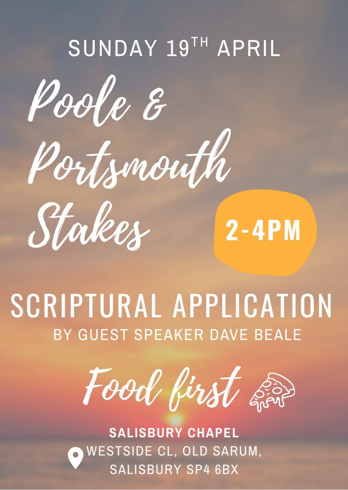 Scriptural Application Guest Speaker: Dave Beale Date: Sunday 19 April 2026Time: 2pm to 4pmLocation: Salisbury Chapel, Westside Close, Old Sarum, Salisbury SP4 6BX Food first followed by devotional for all young adults ages 18 to 35.