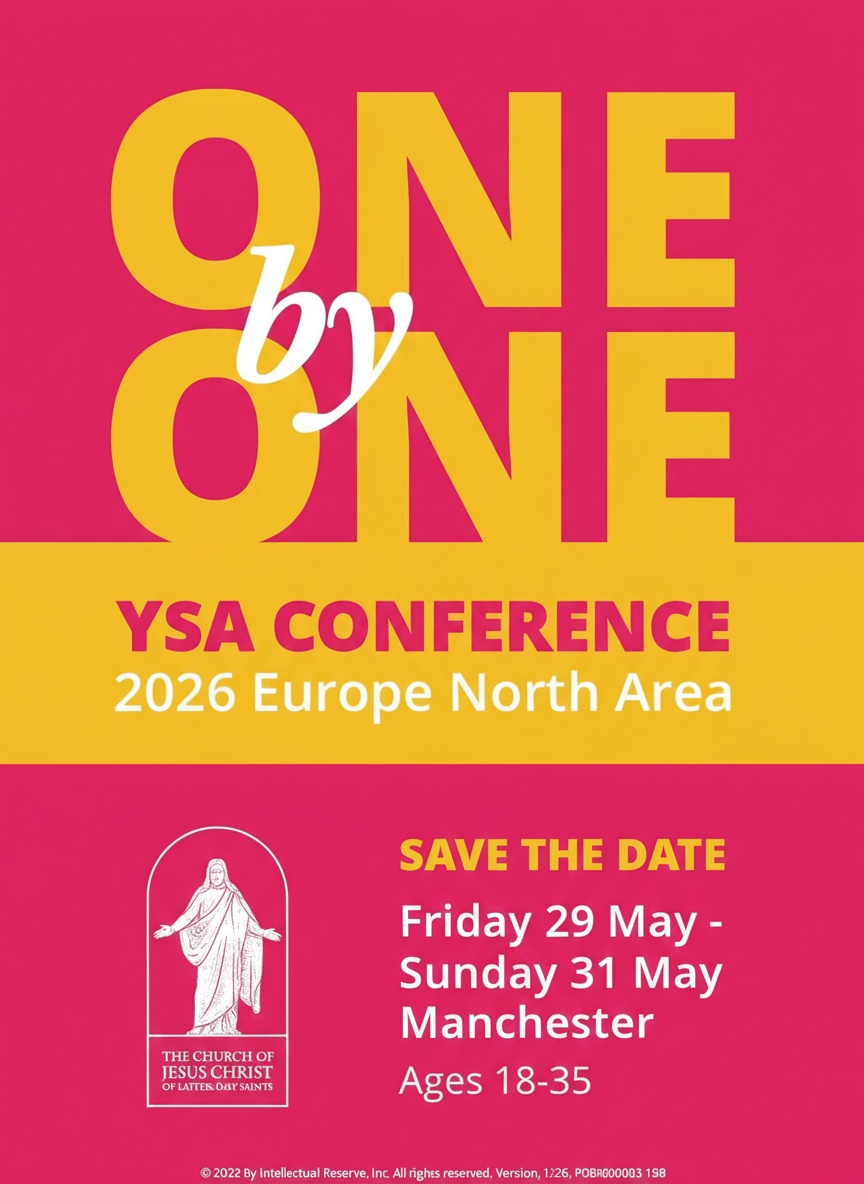 SAVE THE DATE Europe North Area YSA Conference 2026 ONE by ONE Dates: Friday 29 May – Sunday 31 May Location: Manchester Invited: Ages 18-35 THE CHURCH OF JESUS CHRIST OF LETTER-DAY SAINTS