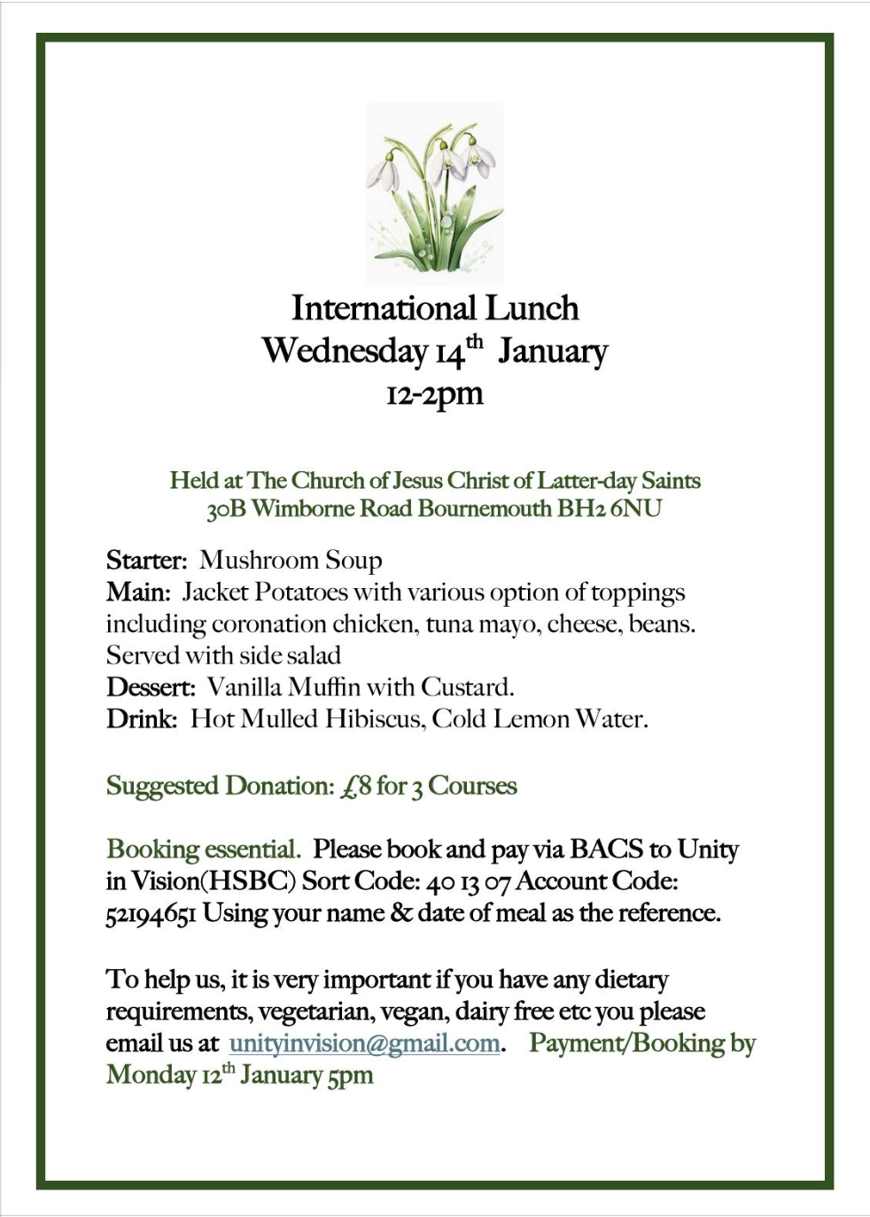 To help us, it is very important if you have any dietary requirements, vegetarian, vegan, dairy free etc you please email us at unityinvision@gmail.com. Payment/Booking by Monday 12th January 5pm